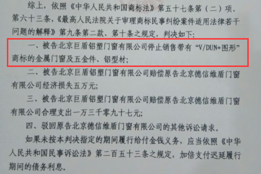 2014年2月5日,北京朝陽區中級人民法院宣判了原告 北京德信維盾門窗有限公司訴被告北京巨盾鋁塑門窗有限公司商標侵權一案,法院認為被告存在明顯攀附原告注冊商標知名度 引人誤解的故意,被告在其銷售的門窗及五金件、鋁型材產品上使用“維盾門窗”品牌進行宣傳,構成侵犯原告注冊商標專用權的行為,并違反了公認的商業道德,構成不正當競爭。