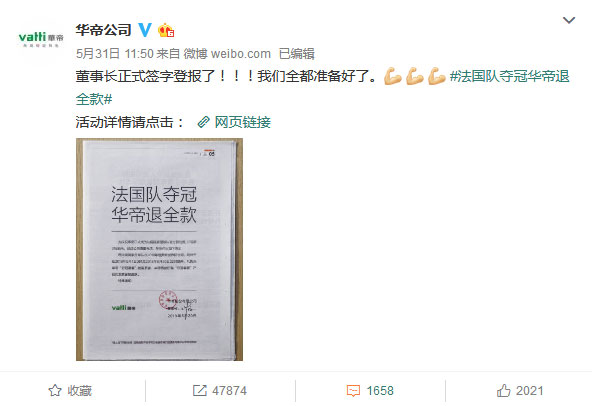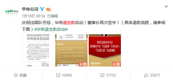 而隨著此次法國隊的奪冠,沒想到最終華帝竟然真的兌現(xiàn)了退全款的承諾。